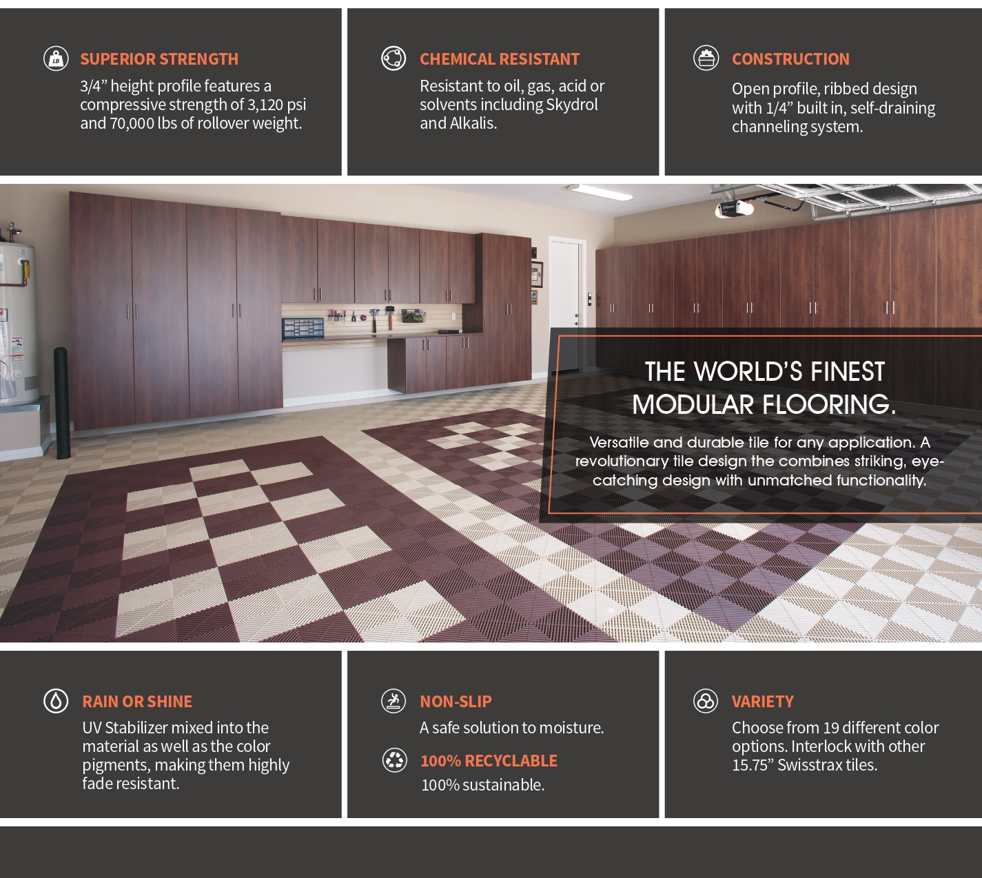 The flooring is made of a durable material that can withstand high temperatures and can withstand over 60,000 pounds of rollover weight. They have a ¾” high profile that can prevent water damage. They are slipping resistant and the self-draining design makes it a breeze to clean. If one of them breaks it will be easy to replace thanks to its six-point interlocking design thanks to Swisstrax which has a patent. Either you epoxy the floor, which is very expensive, or you can use our Swisstrax that will work even on old, cracked garage surfaces.